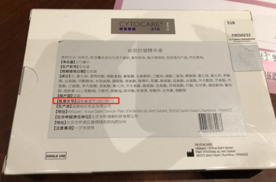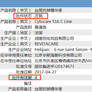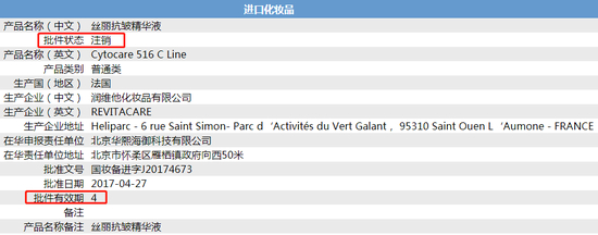 在走访医美机构的过程中,某家医美机构工作人员提供的一款“丝丽抗皱精华液”(型号:516)包装信息显示,该产品的批准文号是“国妆备进字J20174673”,在华申报责任单位是北京华熙海御科技有限公司,从股权关系上,是华熙生物(688363.SH)的全资子公司。
