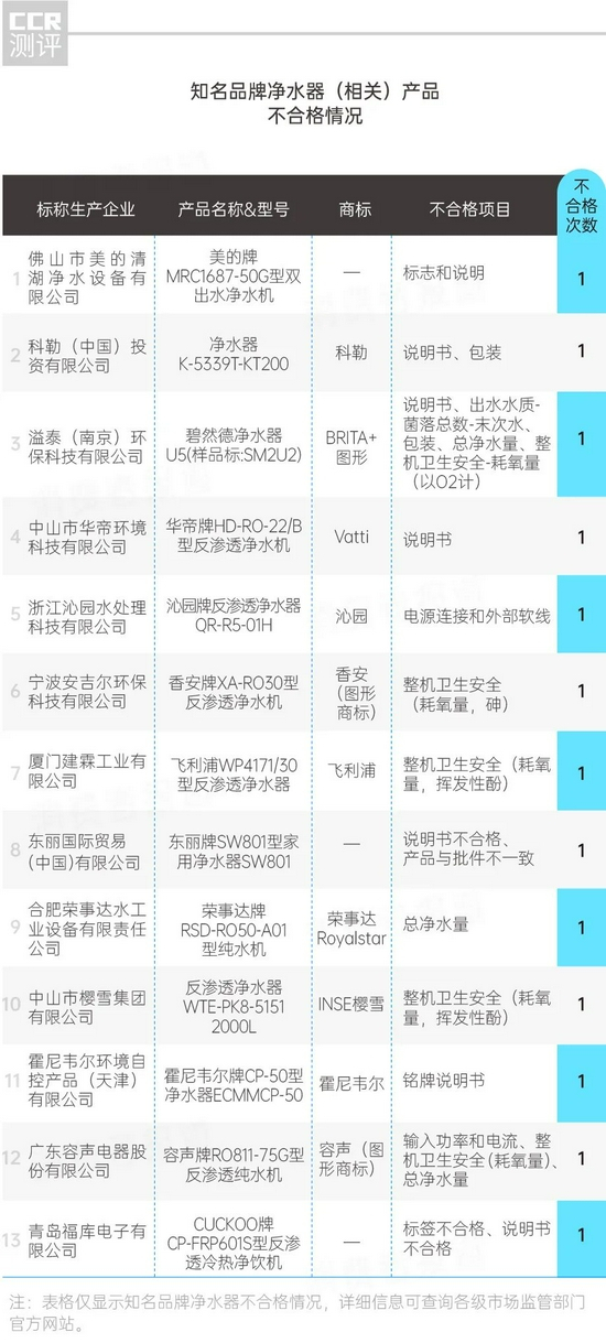 另外值得关注的是,美的、沁园、碧然德、飞利浦、霍尼韦尔等知名品牌都曾有抽检不合格记录。