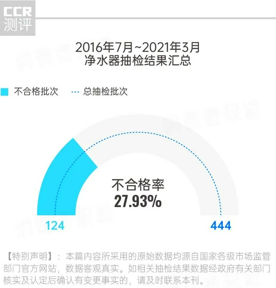 为此,《消费者报道》整理了国家、省市级市场监督管理局以及相关职能部门于2016年7月至2021年3月公布的关于净水器的抽检数据。统计显示,在444批次净水相关产品中,共有124批次被检出不合格,不合格率约为27.93%。