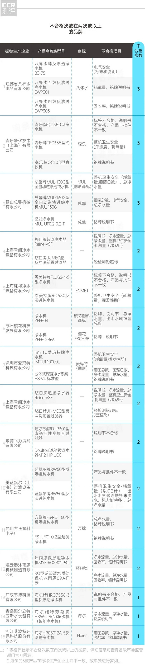 其中,海尔的情况比较特殊,它曾有过3次抽检不合格记录,但涉事产品的标称生产企业有3个,分别是“广东韦博科技有限公司”“青岛海尔施特劳斯水设备有限公司”“青岛海尔施特劳斯水设备有限公司”。
