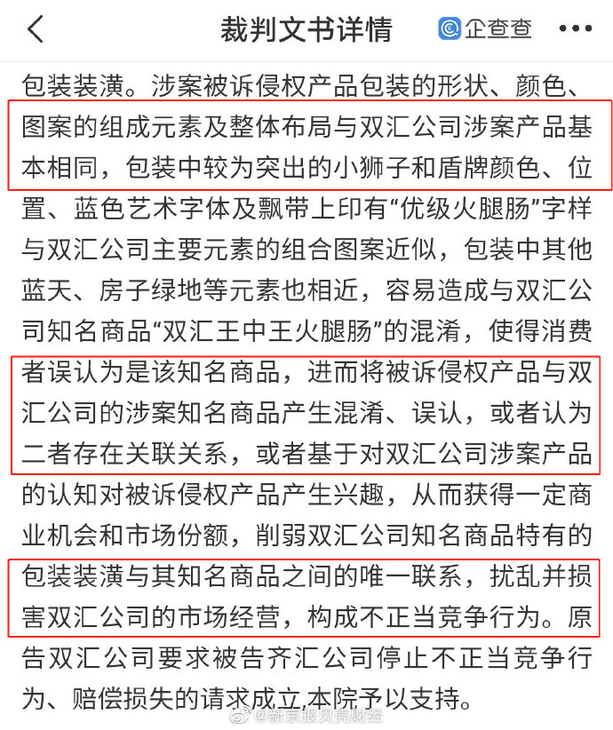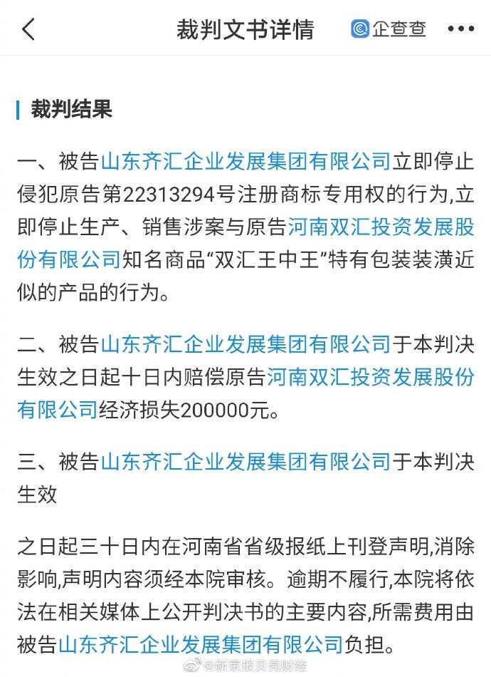企查查APP显示,近日,河南双汇投资发展股份有限公司、山东齐汇企业发展集团有限公司侵害商标权纠纷民事一审民事判决书公开。法院认为原告齐汇公司被诉侵权产品包装的形状、颜色、图案的组成元素及整体布局与原告双汇公司涉案产品基本相同,容易造成与双汇公司知名商品“双汇王中王火腿肠”的产生混淆、误认,构成不正当竞争行为。判决结果为被告齐汇公司立即停止侵权行为并赔偿原告双汇公司经济损失200000元。