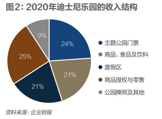 反观迪士尼,其门票收入对于整体收入的贡献并不是大头。其主题公园业务的收入分为五大类,包括门票、商品/食品和饮料、度假区、商品授权与零售、公园牌照及其他。其中,商品授权与零售占比最大,达到25.36%;门票收入位居第二,占24.37%;商品、食品和饮料以及度假村的收入约占20%。