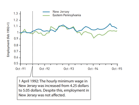 大卫·卡德和艾伦·克鲁格用了一个自然的实验来研究提高最低工资如何影响就业,他们通过新泽西州的餐馆和一个对照组宾夕法尼亚州东部的餐馆来衡量提高最低工资的程度