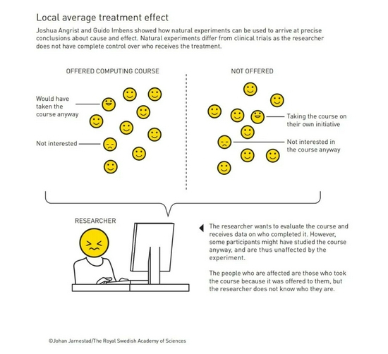 约书亚·安格里斯特(Joshua D. Angrist)和吉多·伊本斯(Guido W. Imbens)展示了如何利用自然实验来得出关于因果关系的精确结论。自然实验不同于临床试验,因为研究人员没有完全控制谁接受治疗