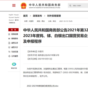 中华人民共和国商务部公告2021年第32号 2022-2023年度钨、锑、白银出口国营贸易企业申报条件及申报程序