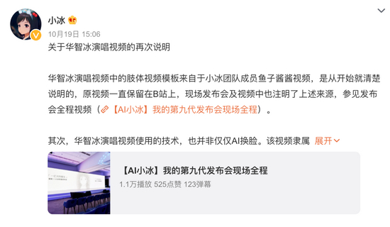 对此,当天下午小冰团队发布《关于华智冰演唱视频的再次说明》。该说明表示,“华智冰演唱视频中的肢体视频模板来自于小冰团队成员鱼子酱酱视频,是从开始就清楚说明的,原视频一直保留在B站上,现场发布会及视频中也注明了上述来源。”
