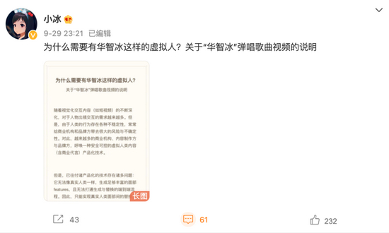 前述“清华首个虚拟学生华智冰正脸出镜唱歌”引发关注后,小冰公司曾于9月29日发布“关于‘华智冰’弹唱歌曲视频的说明”。