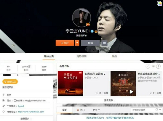 记者搜索发现,李云迪的微博目前已显示暂时处于禁言状态。