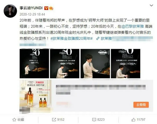 近年来,钢琴演奏家李云迪在多个热门综艺中露面,包括《吐槽大会》《乐队的夏天》《创造营2020》等等,同时也有多个商务代言合作。