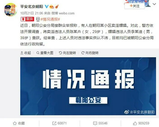 10月21日晚,北京警方通报称,钢琴演奏家李云迪因嫖娼被朝阳公安分局行政拘留。