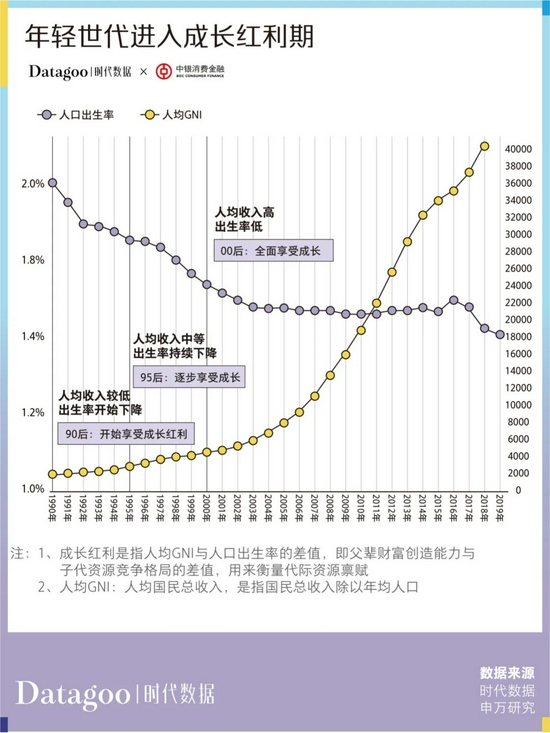 申万研究发布的一份报告数据显示,越年轻的群体享受的成长红利越多。