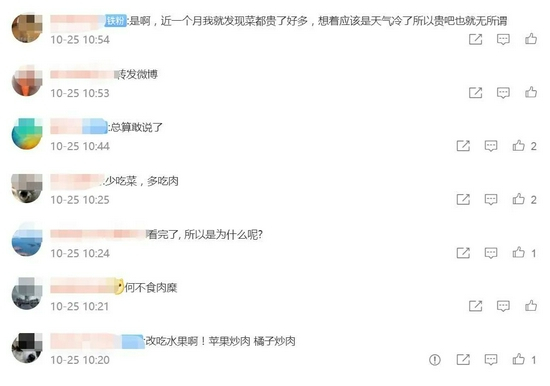 有网友调侃,“少吃菜,多吃肉”“改吃水果啊,苹果炒肉,橘子炒肉”。