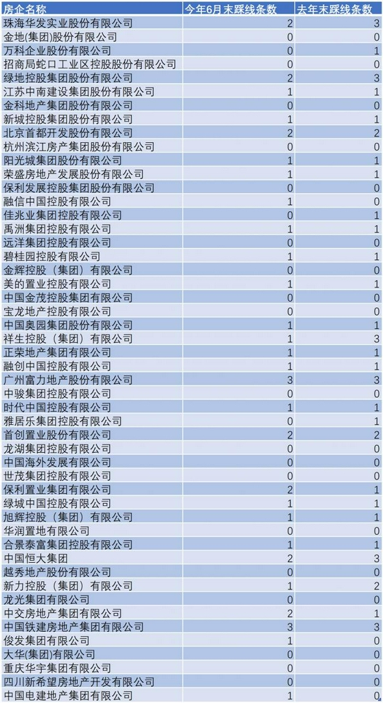 截至今年6月末, “三道红线”全踩(现金短债比宽口径,计算公式:现金及现金等价物/短期有息债务)位于“红档”的TOP50房企有铁建房产、富力地产。