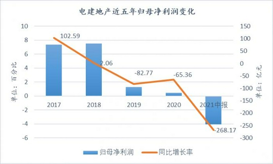 观察电建地产近5年的利润水平可以发现,公司净利润一直呈下降趋势,且在今年上半年跌幅进一步扩大。据Wind数据,电建地产归母净利润从2018年的7.51亿,一路下滑至2019年的1.29亿,2020年勉强盈利0.45亿,今年上半年甚至亏损4.08亿。去年电建地产营收就开始下滑,今年上半年营收更是下滑35.7%。