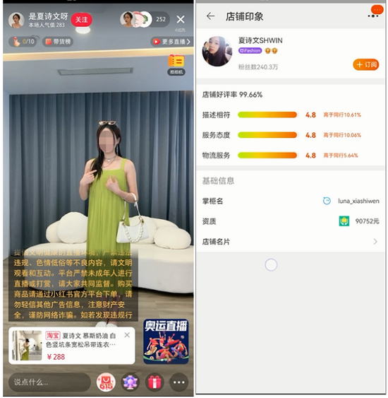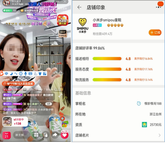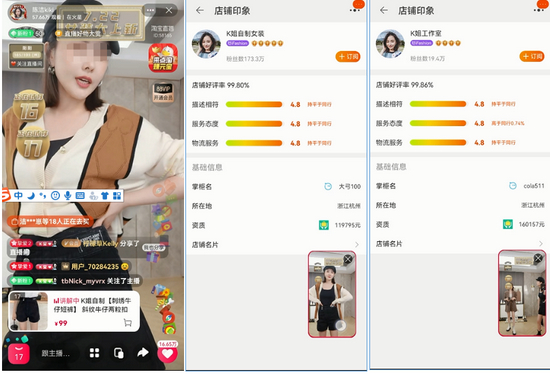 例如,体验人员在淘宝“烈儿宝贝”、淘宝“陈洁kiki”、快手“蛋蛋6.16收官•设计师服饰专场”等直播间体验购物时,均存在没有看到店铺公示证照信息情况。