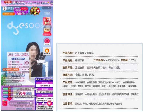 案例 ■ 体验人员在淘宝“瘦身女王郑多燕”直播间看到,主播在介绍一款白玉荔枝风味饮料时,宣称 “吃一天就有效果”,“可以帮助你来排油,管理到大肚腩,又可以去除湿气”;