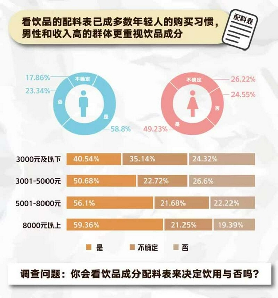 当肥胖、失眠、脱发等烦恼通通袭来时,对于挑选饮品这件事,年轻人表现得“求生欲”满满。调研结果表明,近八成的年轻人在乎饮品对身体健康的影响,超半数的问卷受访者在购买饮品时有看配料表的习惯。其中,男性比女性对饮品配料更敏感。此外,受访者收入越高,对饮品配料成分的重视程度越高。