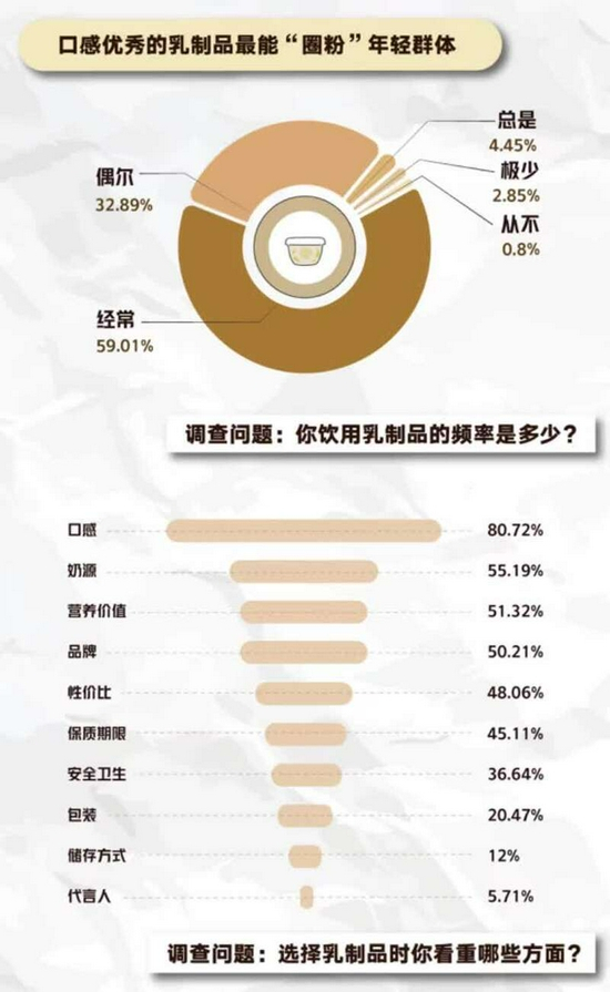 数据还显示,近六成受访者经常饮用乳制品,除口感优秀外,奶源、营养价值、品牌与性价比都是年轻群体挑选乳制品时看重的关键要素。这似乎也解释了,蒙牛、伊利等传统乳品品牌在产品上的创新趋势,以及诸如北海牧场等新锐乳品品牌在市场上的异军突起。