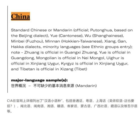 文章提及,“CIA在官网上详细列出了‘汉语小语种’,包括普通话、粤语、吴语(上海话)、闽北语、闽南语、湘语、赣语、客家话,”同时还有少数民族语言,如蒙古语、广西壮语、藏语以及维吾尔语等,并辅以截图佐证。