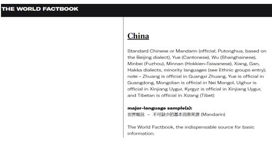 该说明列举了世界上绝大部分国家正在使用的语言,中国只是其条目中的一项。