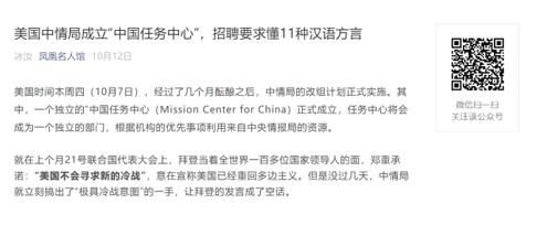 类似的消息也在微信平台上传播。10月中旬,一篇名为《美国中情局成立“中国任务中心”,招聘要求懂11种汉语方言》的公众号文章写到:“中情局的改组计划正式实施,其中,一个独立的‘中国任务中心(Mission Center for China)’正式成立。”