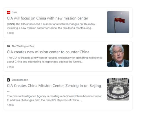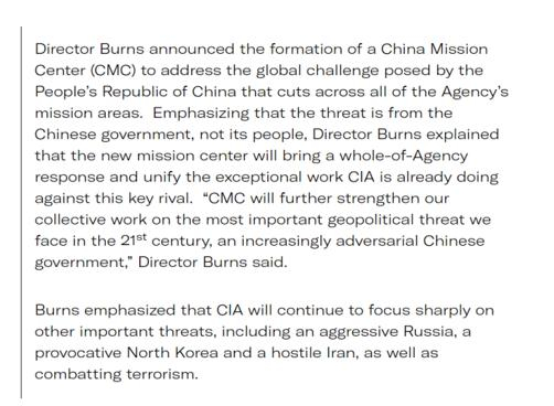 这篇报道宣称,中国带来的全球挑战已经渗入CIA的各个工作领域,为解决这一问题,CIA局长伯恩斯宣布将成立中国任务中心(CMC)。新的任务中心将会举全局之力,并结合CIA已在进行的杰出工作,来应对(中国)这一关键对手。