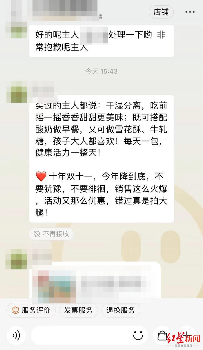 值得一提的是,尽管记者提出不愿再收到营销短信,对话结束后,有几家店铺的对话框里仍然弹出了商品促销活动。