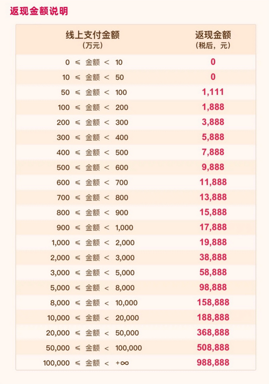 大额返现看起来也颇吸引人。11月1日至11日,买受人在线上付尾款,单个标的付款累计达到50万元以上,便可100%领取大额返现,返现金额从1111元至98万元不等,将以支付宝余额的形式返入账户。