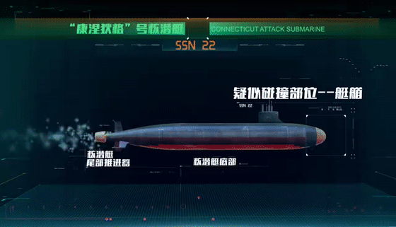·“康涅狄格”号核潜艇碰撞事故动画示意。图片来源:央视新闻客户端。
