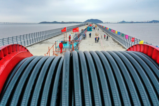 2021年3月27日,施工队在宁波舟山港主通道舟岱大桥敷设高压随桥电缆。图|IC photo