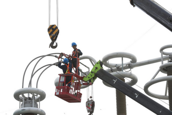 2019年10月12日,检修工人在宁夏灵武市白土岗乡灵州换流站对±800千伏灵州—绍兴特高压直流输电线路进行检修。 图|中新社