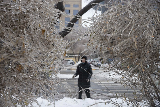 2021年11月8日,哈尔滨迎来雨雪冰冻天气,一名市民在观看结冰的树木。 新华社记者 张涛摄