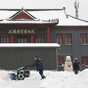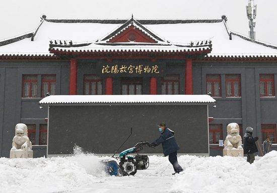 2021年11月8日,沈阳出现暴雪天气,在沈阳市沈河区的沈阳故宫门前,保洁人员在清理积雪。 新华社记者 蔡湘鑫摄