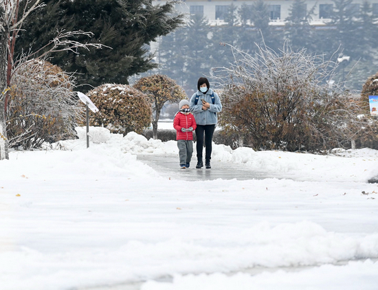 2021年11月8日,吉林省出现雨雪冰冻天气,市民在长春街头行走。 新华社记者 颜麟蕴摄