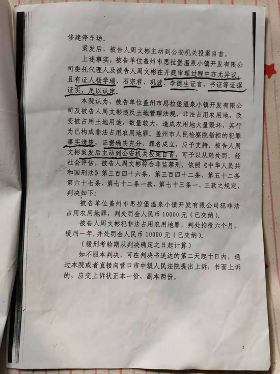 辽宁省盖州市人民法院2021年5月18日的刑事判决书 (2020)辽0881刑再1号显示,经再审查明,2008至2015年期间,盖州市思拉堡温泉小镇开发有限公司非法占用农用林地 66.61 亩。案发后,时任公司法定代表人、执行董事兼经理的杨学瑞安排公司副总经理李德生处理此事,李德生找到被告人周文彬顶罪,周文彬在原审中主动投案自首,并在侦查、起诉、审判期间均对非法占用农用地的犯罪事实供认不讳,认罪认罚,被以非法占用农用地罪判处拘役六个月,缓刑一年,并处罚金人民币10000元。