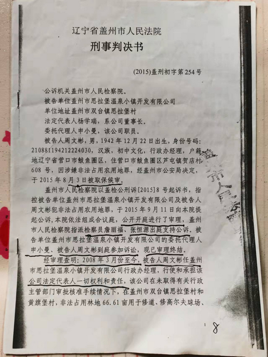 “2015年8月的一天,公司副总经理李德生找到了我,说是公司之前在修建高尔夫球场、滑雪场、停车场,还有修道时占地毁了点树,现在要打官司,让我去给签点证实材料。他告诉我证实材料的内容已经写好了,去签个字就完事。”周文彬告诉记者,当时他根本没敢多想,公司领导吩咐了什么,他就听从命令去了,李德生安排了一位办事员谭国宏开车拉着他,去了盖州市公安局森林公安分局,李德生和一位吴姓局长当时也在现场,“材料当时也没让我看,李总说你签字就完了。”周文彬回忆,按照李德生的吩咐,他在一份有六七页的材料上逐页签字画押,签完之后就被拉回了公司。此后,他又被谭国宏开着公司的车拉着陆续去了盖州市人民检察院和盖州市人民法院几次,也是同样的流程,去了之后在材料上签字就让走了。