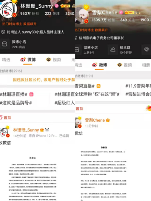 雪梨在个人签名为“杭州宸帆电子商务公司董事长”的个人微博上发布致歉信,称“身为创业者及主播,忽视了专业财税知识的学习,税收法律意识淡薄,导致违反了相关税收法规。完全接受税务部门依法作出的行政处罚决定。并将暂停直播间直播,进行规范和整顿。”林珊珊在其个人微博也发布致歉信称,“在接受调查期间,我接受了国家税务主管部门的教育并积极配合,深刻意识到自己税法知识的匮乏,税收法律意识淡薄,导致违反了相关税收法规。虽然直播电商是新兴行业,但并不意味着能够忽视合规。相信经过此次行业整顿,直播电商行业会更加规范。”