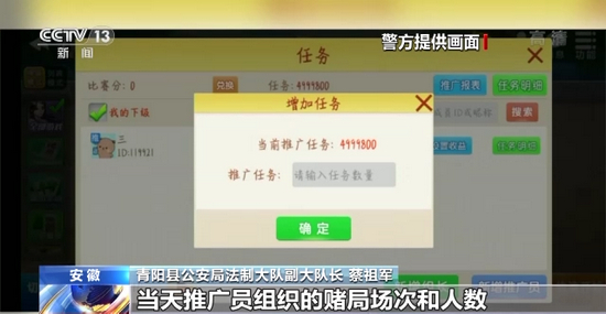 青阳县公安局法制大队副大队长 蔡祖军:线下推广有省、市代理和推广员组成,推广员是具体的经办人,负责组建微信群邀人聚赌,每局游戏平台都会自动抽取参赌人员2个积分,也就是2块钱,然后平台按照当天推广员组织的赌局场次和人数,将抽取赌资总数的40%提成到推广员的账户,有些推广员一天的提成能达到近万元,因此,在高额回报的利诱下,推广员会非常积极地拉人头来网上赌博。