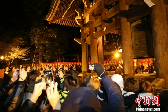 2014年1月1日零时,日本京都知恩院响起了第108次钟声,这是日本传统的“除夜之钟”仪式,每年都会有大批民众前来观看这一仪式。中国亦有新年撞钟祈福的传统。中新社记者 高越 摄