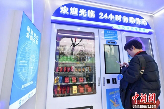 2018年12月,昆明街头新开设的“智慧药店”吸引市民体验。该药店24小时自助售药,并借助支付宝扫脸身份认证,实现“刷脸购药”。中新社记者 任东 摄