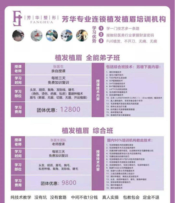 以麦子植发培训的“植发植眉全能弟子班”为例,学习时间为3天,学习部位包括头发、胡须、鬓角、发际线、(烧伤、私密)重建种植术、眉毛等,费用原价118000元,现需9800元。