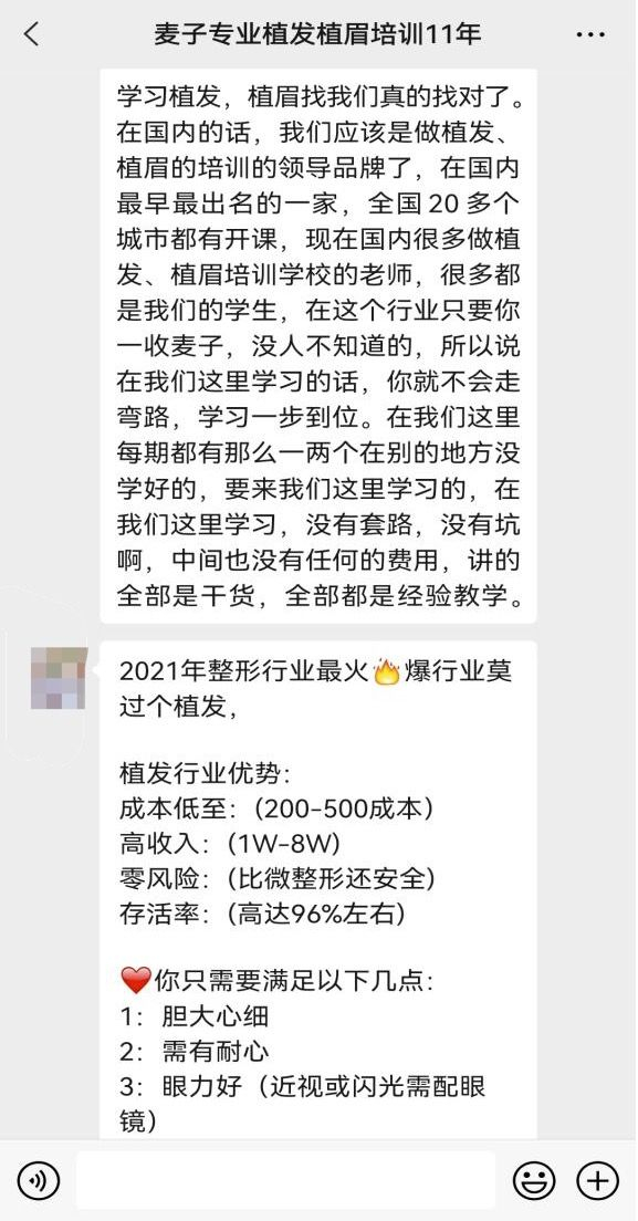 植发市场火热的同时,诞生了一批植发培训机构,宣称可零基础学习,内容包括各种“独家”技术和大机构所使用的技术。