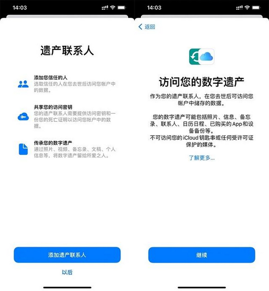 据法治周末记者了解,用户最多可以指定5个人作为遗产联系人,这5个联系人可以接收用户存储在iCloud中的数据和个人信息。