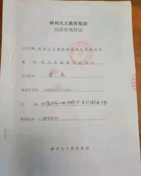 2017年1月,童敏以投资天立合作项目为由与王必珍(化名)签订协议,后者投入24万元,童敏则承诺每年底按利润分红。在高额分红利诱下,2018年12月23日、2019年1月19日,童敏与王必珍又签订了神州天立教育集团高管补充协议(资金组成及分红补充),王必珍追加投资420万元。