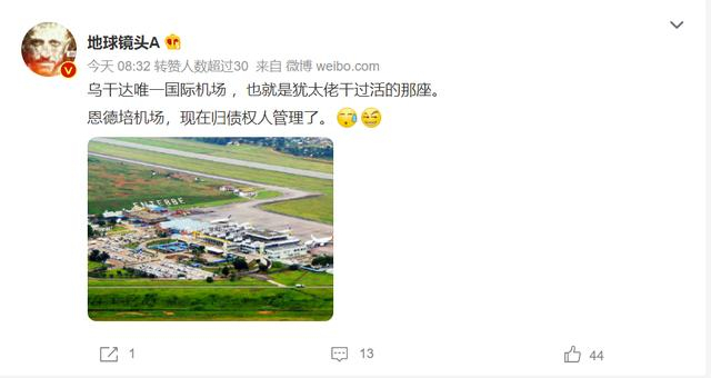 近日,推特上流传一则消息称,因乌干达政府拖欠中国债务,中国将接管该国唯一的国际机场——恩德培国际机场。