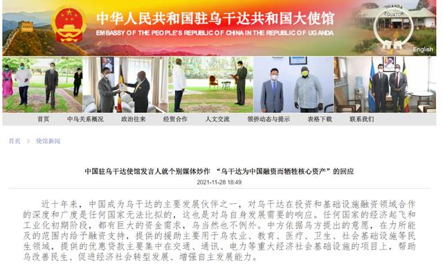 中国驻乌干达使馆发言人还强调,中乌合作一贯秉持公开透明、平等互利原则,包括恩德培机场改扩建项目在内的所有贷款协议均由双方通过对话协商自愿签订,不存在任何隐藏条款,不附加任何政治条件。恩德培机场改扩建项目协议条款完全符合国际金融市场通行惯例。