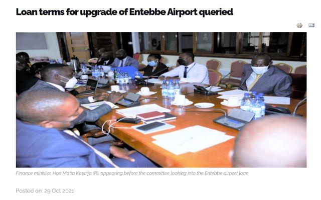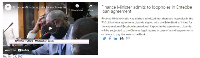 10月28日,肯尼亚私人媒体公司国家媒体集团子公司、推特认证媒体NTVUganda在其官网、官方推特和YouTube账号上分别发布了一条长达2分56秒的视频,称乌干达财政部长卡萨亚(Matia Kasaija)向议会承认,与中国签订的恩德培贷款协议存在漏洞。