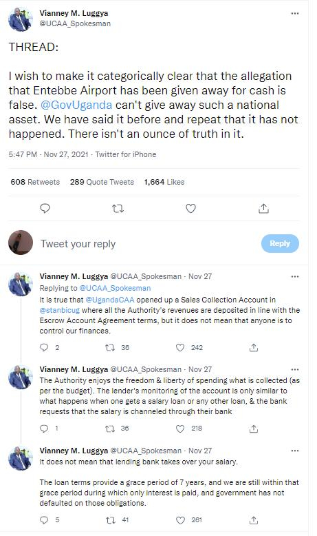 11月27日,乌干达民用航空管理局发言人拉格亚(Vianney Luggya)在其推特账号发布声明:“我要明确指出,有关恩德培机场被送去换取现金的指控是虚假的。乌干达政府不可能放弃这样的国家资产。我们以前说过,并重申这一点没有发生。这里面没有一丝事实。”