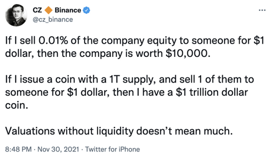与以往不同的是,赵长鹏今日发推表示,如果我以1美元的价格将公司0.01%的股权出售给某人,则该公司价值10,000美元。如果我发行1万亿供应量的代币,并将其中1个以1美元的价格卖给某人,那么我就有了1万亿美元的代币。没有流动性的估值意义不大。