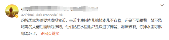 正如网友所说,想想国家为啥要禁虚拟货币,跟着一帮不愁吃喝的大佬后面玩泡沫,他们站在水里可能只是没过了脚背,你可能就得淹死了。
